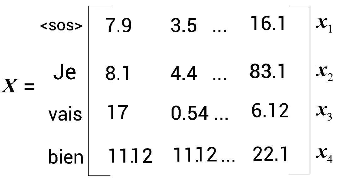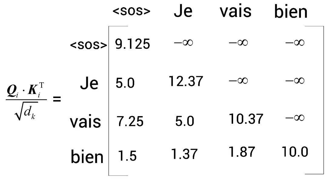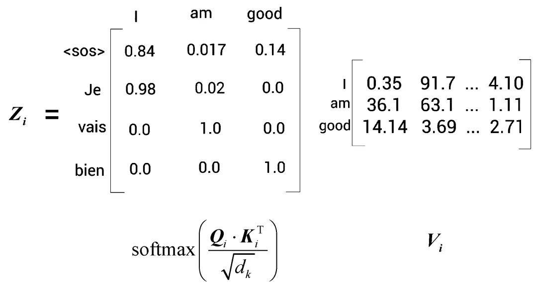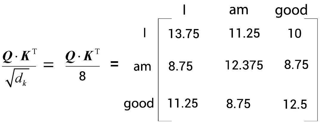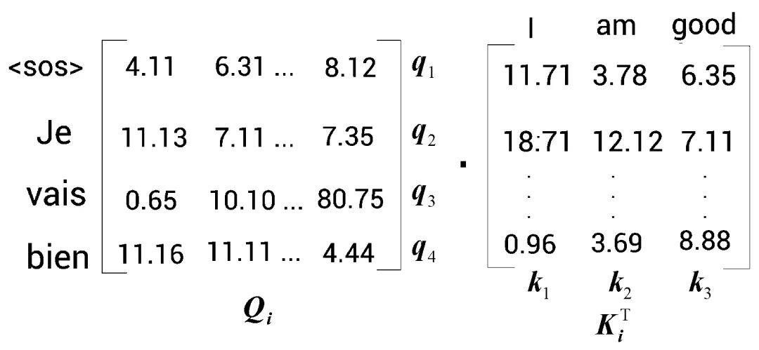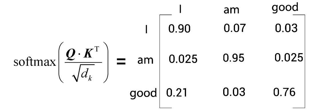 (good)的点积。因此,第1行表示目标词<sos>与原句中所有的词(I、am和good)的相似度。