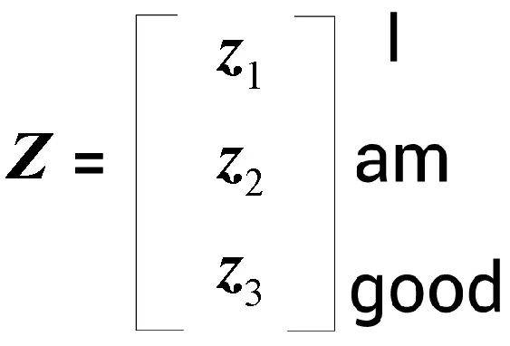 为简单起见,我们假设输入句(原句)为 I am good(我很好)。首先,我们将每个词转化为其对应的词嵌入向量。需要注意的是,嵌入只是词的特征向量,这个特征向量也是需要通过训练获得的。