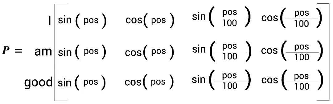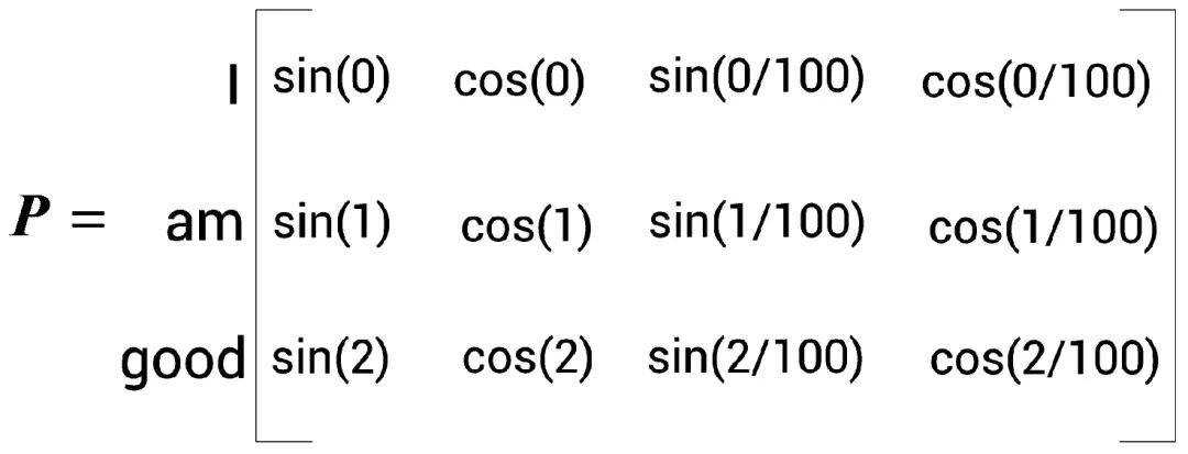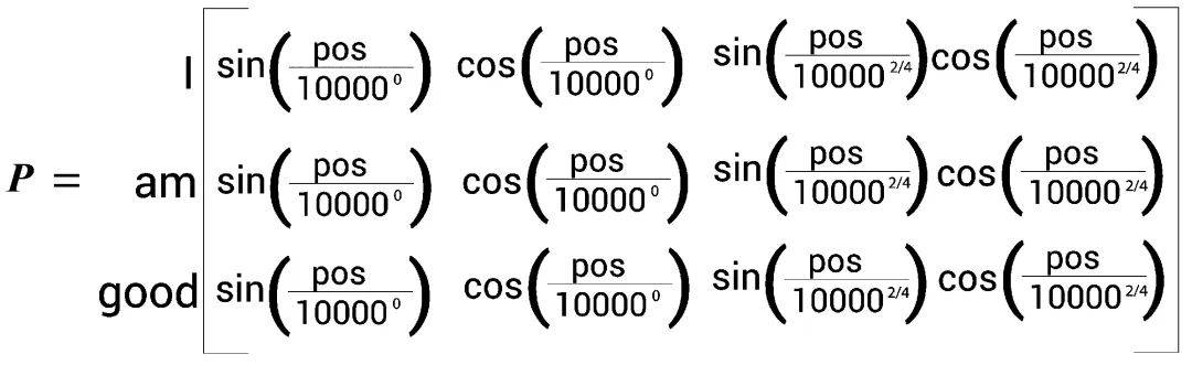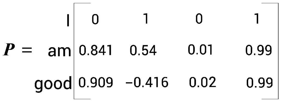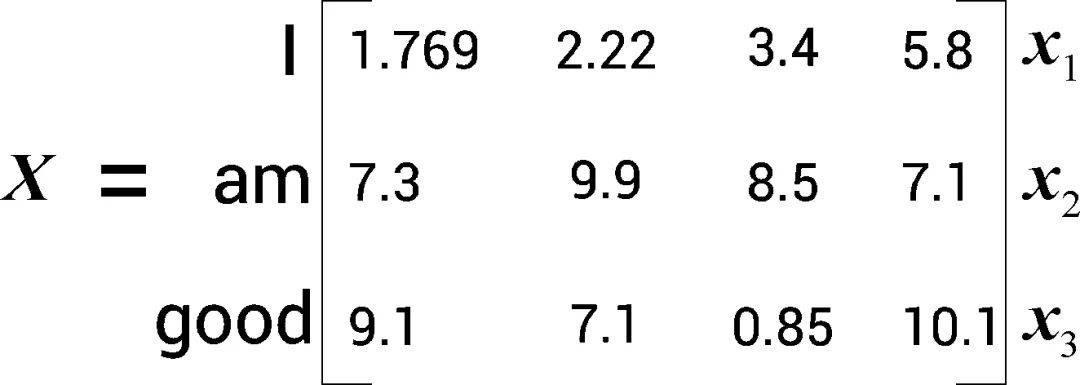 ,我们可以看出,矩阵的第一行表示单词 I 的词嵌入向量。以此类推,第二行对应单词 am 的词嵌入向量,第三行对应单词 good 的词嵌入向量。所以矩阵