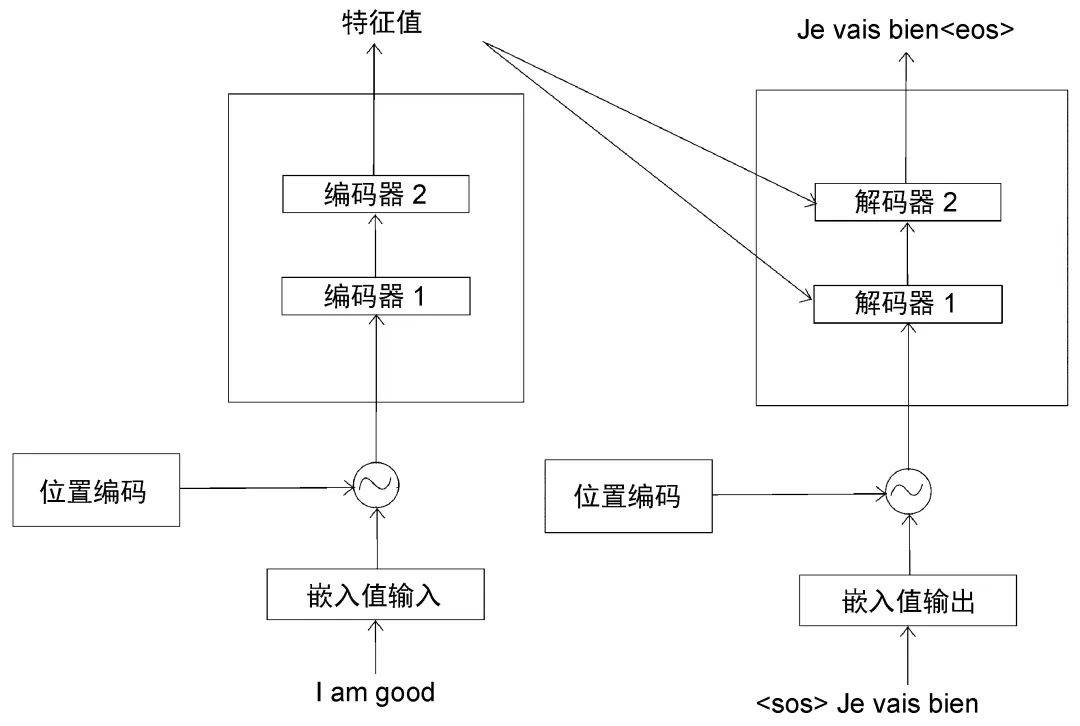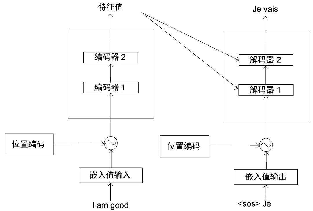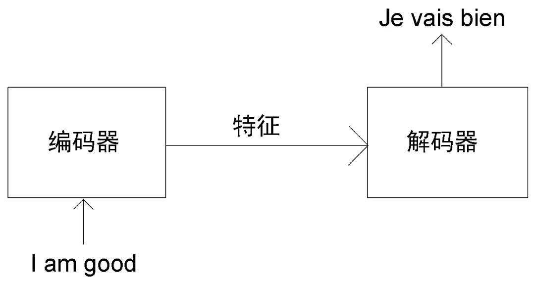 假设我们需要将一个句子 从英文翻译为法文。如图 1-1 所示,首先,我们需要将这个英文句子(原句)输进编码器。编码器将提取英文句子的特征并提供给解码器。最后,解码器通过特征完成法文句子(目标句)的翻译。