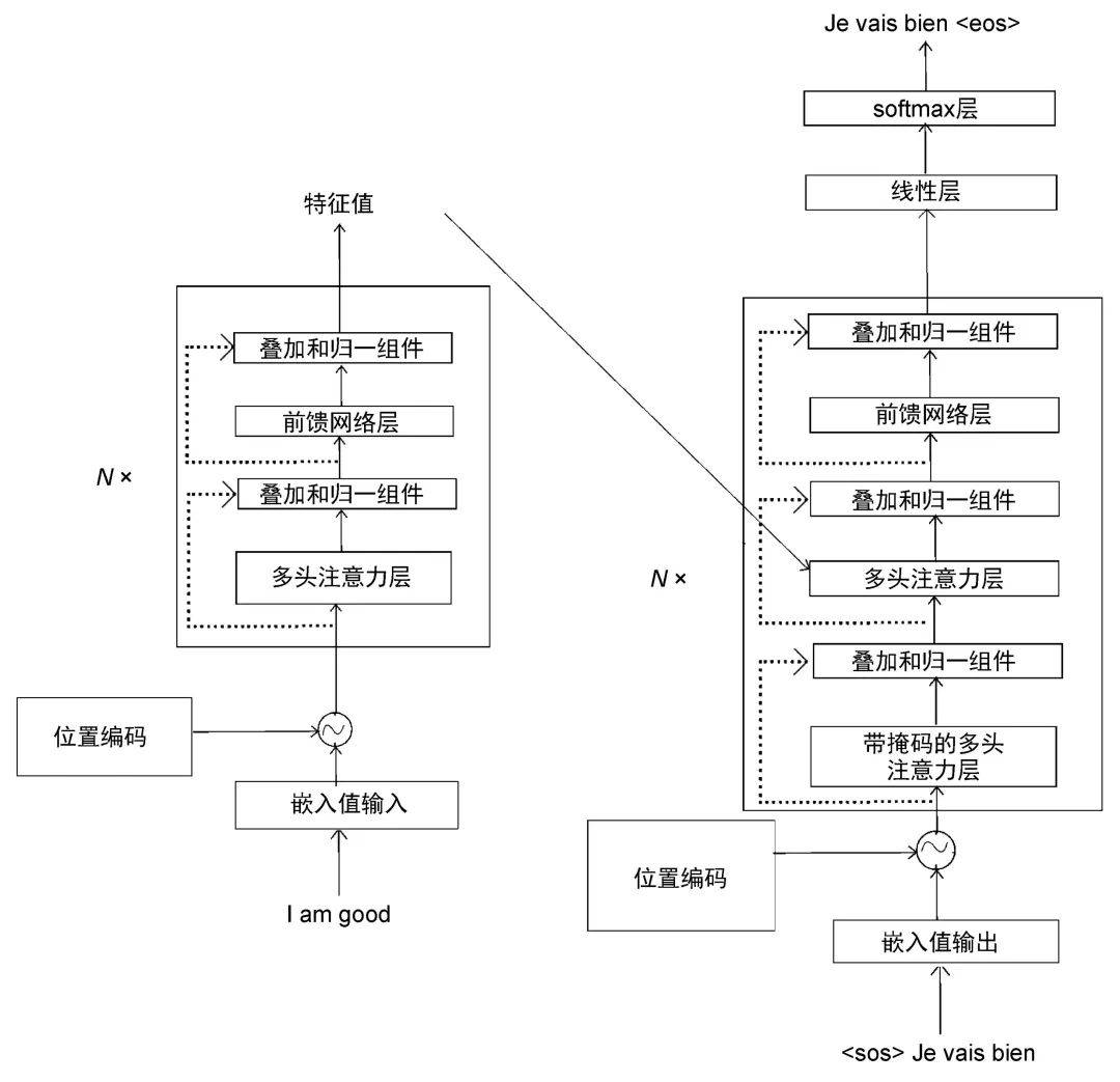 图 1-63 完整地展示了带有编码器和解码器的 Transformer 架构。