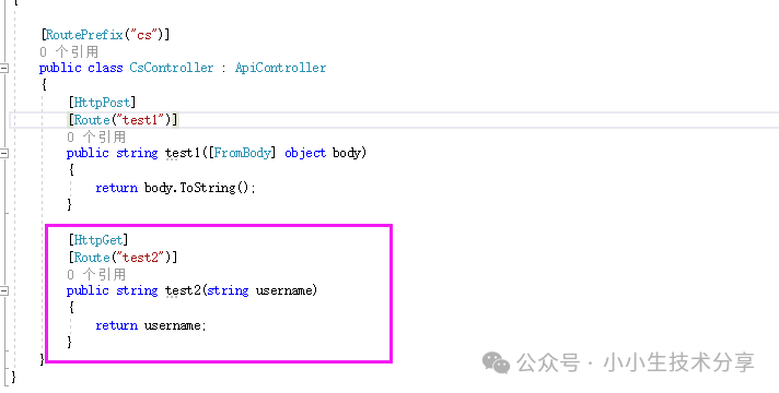 1.新建一个Web Api接口 CsController.cs 2.新建一个Post接口,然后返回值就是入参,路由地址cs/test1 3.新建一个Get接口 阅读原文:原文链接 该文章在 2025/7/7 11:55:46 编辑过 |