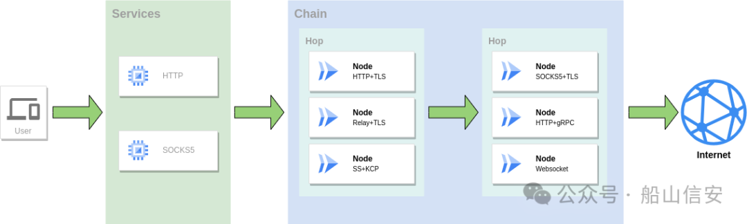 作为代理服务访问网络,可以组合使用多种协议组成转发链进行转发。