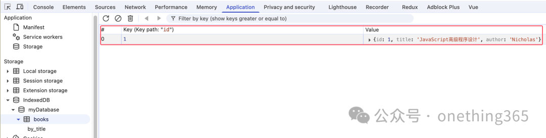 store.add({ id1title'JavaScript高级程序设计'author'Nicholas' });