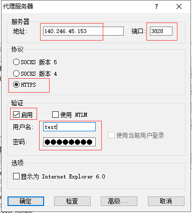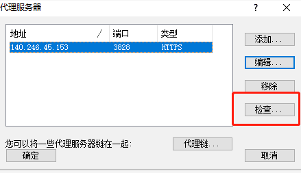 4) 在弹出的“代理服务器”对话框中,输入代理服务器的IP地址和端口,选中“HTTPS”或者"socks 5"单选按钮(具体是HTTPS还是SOCKS 5视业务要求而定),再单击“确定”按钮。如下图,假设用户购买了长效IP 140.246.45.153,端口3828 ( 实战中换成您实际购买的长效IP和端口,或者是隧道代理地址和端口也可,其中隧道代理还具备定时切换和按请求转发切换的超能力哦!),如果有用户名密码也填上。(特别注意:如果是隧道代理使用白名单验证和使用用户名密码验证 端口号是不同的,具体参见购买的隧道代理的详情页面)。5) 在“代理服务器”对话框中,单击“检查”按钮。6) 在弹出“代理检查器”对话框中点击“开始测试”,将显示测试信息。绿色代表测试通过!1) 在Proxifier的“配置文件”菜单上,单击“代理规则”选项。