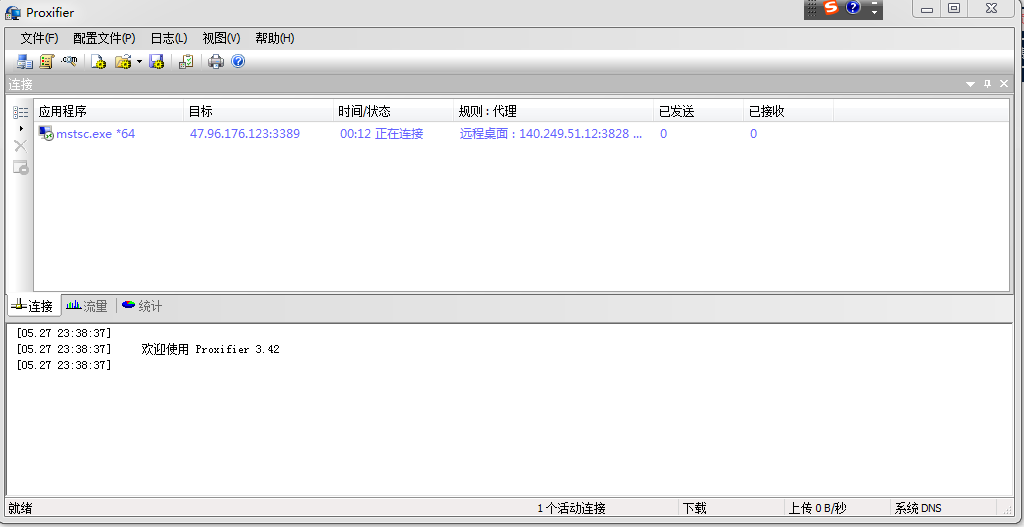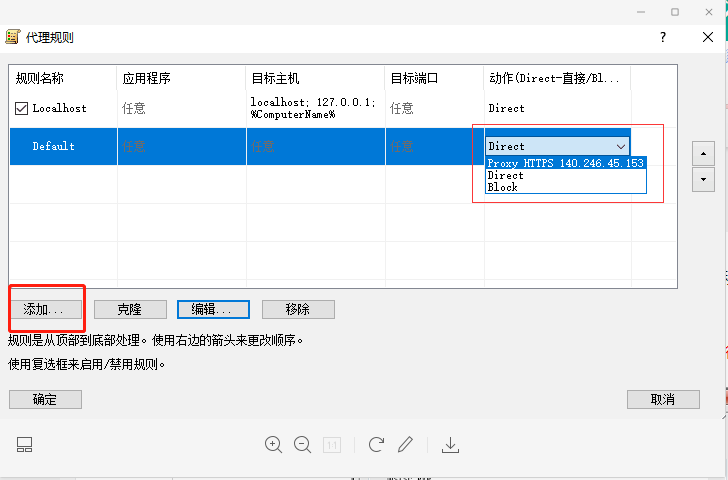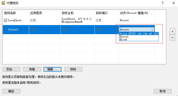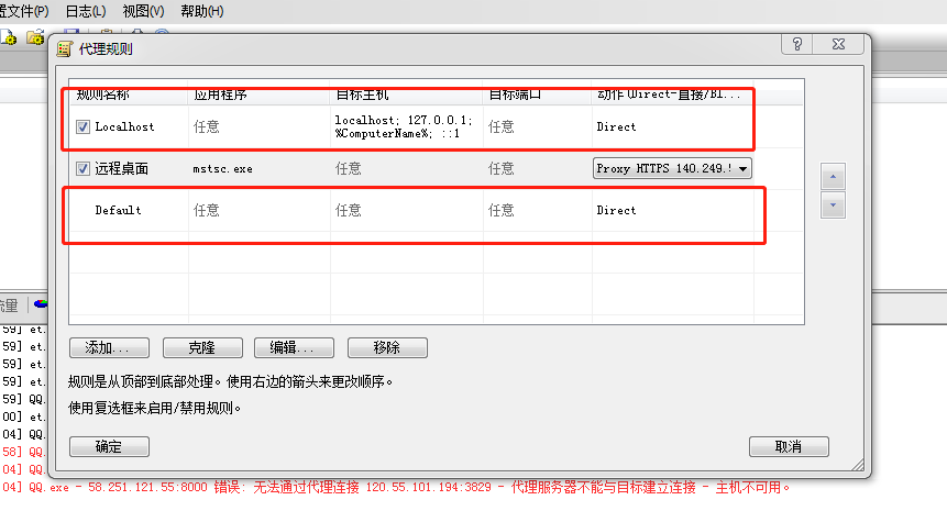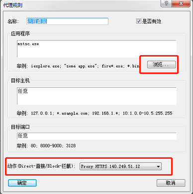 2) 在弹出的“代理规则”对话框中,选中“Default”这一行,单击“动作(直接/拦截)”组合框,选择“Proxy HTTPS 140.246.45.153”,再单击“确定”按钮。(注意:下面的“添加”按钮也可以去指定一个特定的程序,只修改它的IP,那就不是全局代理了,而是指定进程代理!该功能很强大!)下面重点讲一下如何只指定特定的程序被代理:比如要指定“远程桌面”这个程序被代理,那么就点击刚才图中的“添加”按钮。然后出现下图中,“名称”随便取个名字比如填写“远程桌面”,然后点击“浏览”指定你要代理的那个程序(找到那个程序的路径,或者填写该程序运行起来后在WINDOWS任务管理器里面的进程名称)。其中目标主机和目标端口填写为"任意"即可,“动作” 下拉框里选择您之前配置的长效IP或者隧道代理地址即可,然后单击“确定”。如上图,这就搞定了! 如果只想让“远程桌面”这个应用被代理,则localhost和default都不要设置代理,选择Direct即可! 看到没,这下仅有“远程桌面”这个程序被代理!如下图:3) 设置完成,客户端上的网络应用可以通过代理上网了。