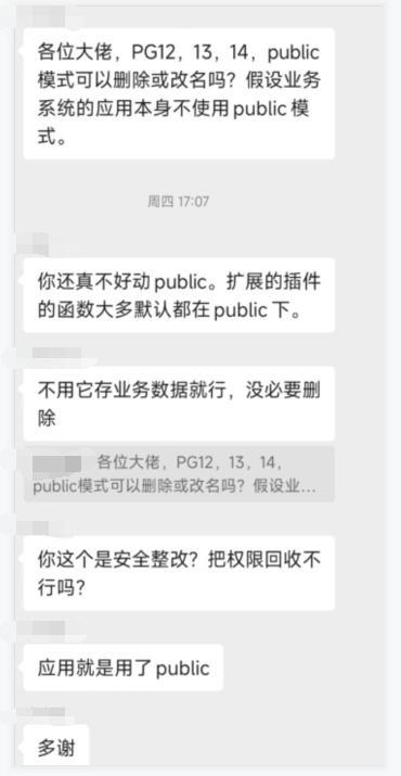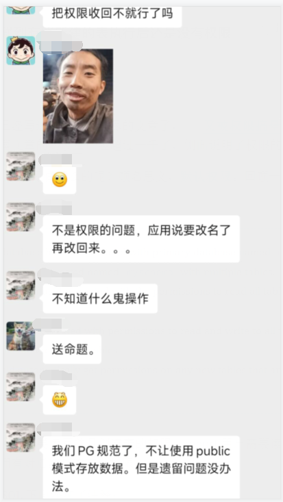 因为这位群友的公司的PG规范做了修改,不让使用public模式存放数据,但是遗留问题没办法。