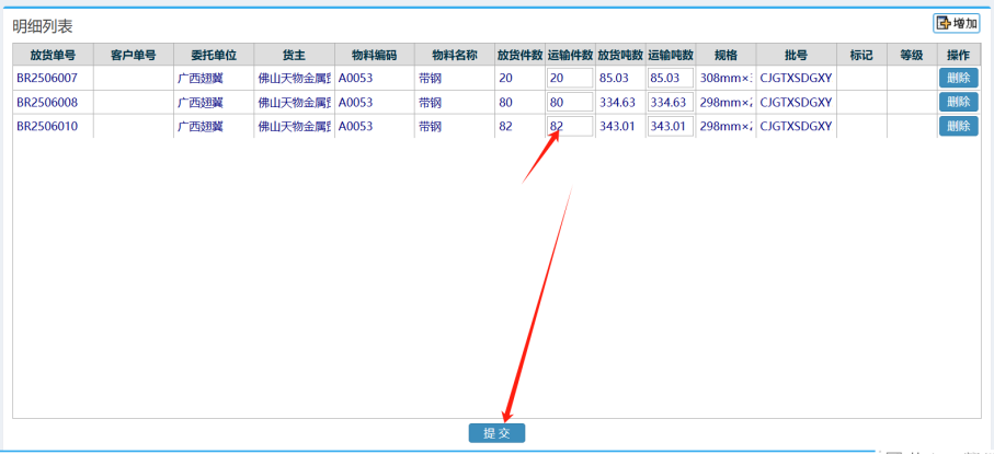 3. 点击增加后,勾选对应的清单,核对相关运输件数,点击提交按钮完成