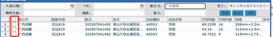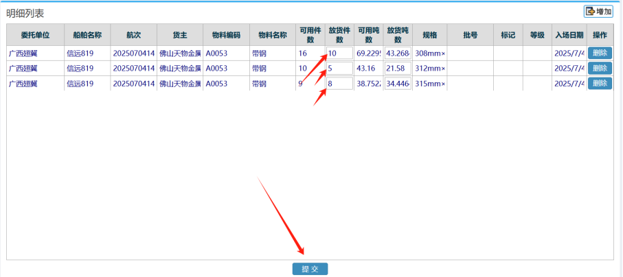 3. 点击增加后,勾选对应的清单,核对并录入相关放货件数,点击提交按钮完成