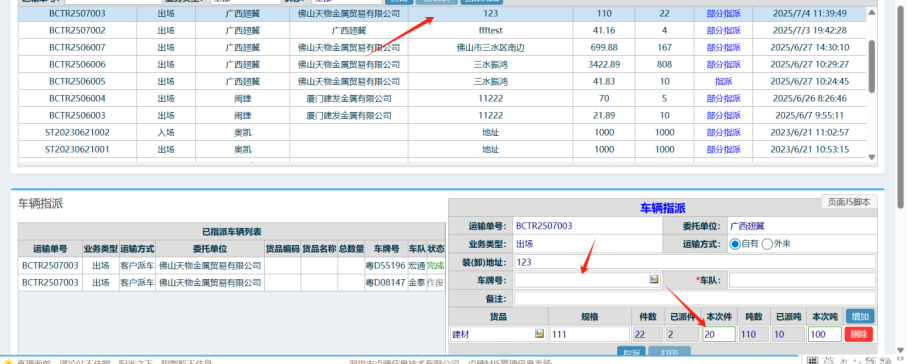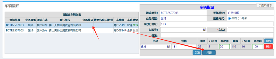 2.进入界面后,选择对应的运输单,指派对应车牌号,录入派车的件数,点击指派按钮