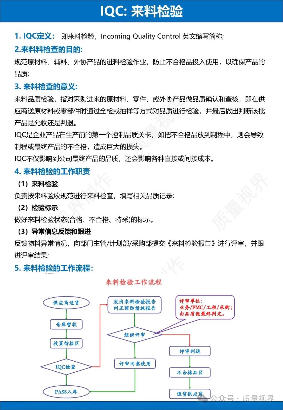 IQC 是 “Incoming Quality Control” 的缩写,意思是 “进料质量控制”,也被称为 “来料检验”。以下是详细介绍: