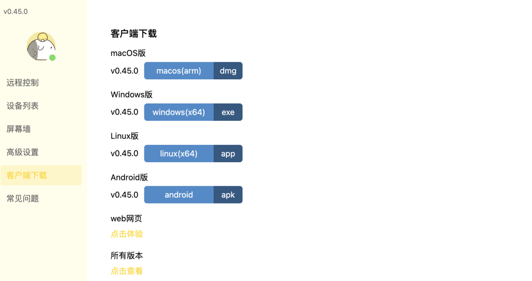 - • 支持网页控制桌面或移动端,也支持客户端间交互(电脑↔电脑、电脑↔安卓、安卓↔网页等)