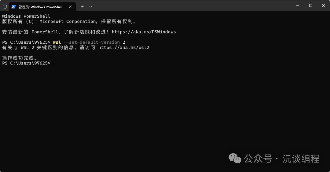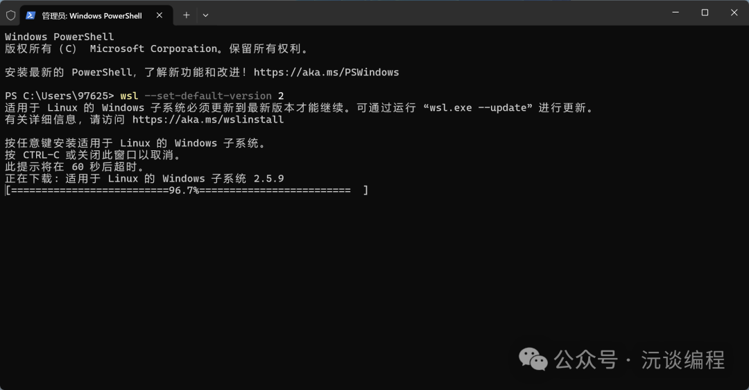 通过上面命令可以设置默认版本为 WSL2,若 WSL 版本低要先更新: