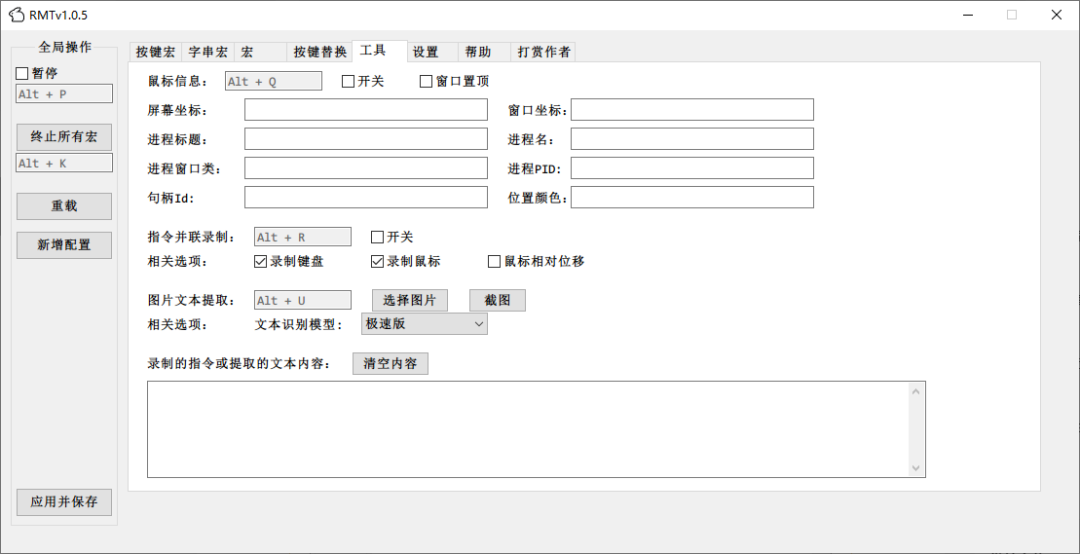 RMT(若梦兔) 这是一款基于 AutoHotkey v2 的免费开源按键宏工具,旨在让用户通过简单的配置即可实现多种自动化操作。该工具支持按键宏、鼠标宏以及手柄宏的录制和播放,并集成了图片识别、颜色识别和文本识别等多种功能,能够满足从游戏辅助到提升办公效率的多种需求。无论是需要重复性操作的任务,还是复杂的交互流程,RMT 都可以通过一键化的方式轻松处理,让你的工作和娱乐变得更加轻松和高效。把这个任务交给代码,那么我就可以去做更有意义的事情了! https://pan.quark.cn/s/1555aec32e10 https://pan.baidu.com/s/19tQ1tkTpDjDreqS7RzxgxA?pwd=8888 ![]() 主要功能: