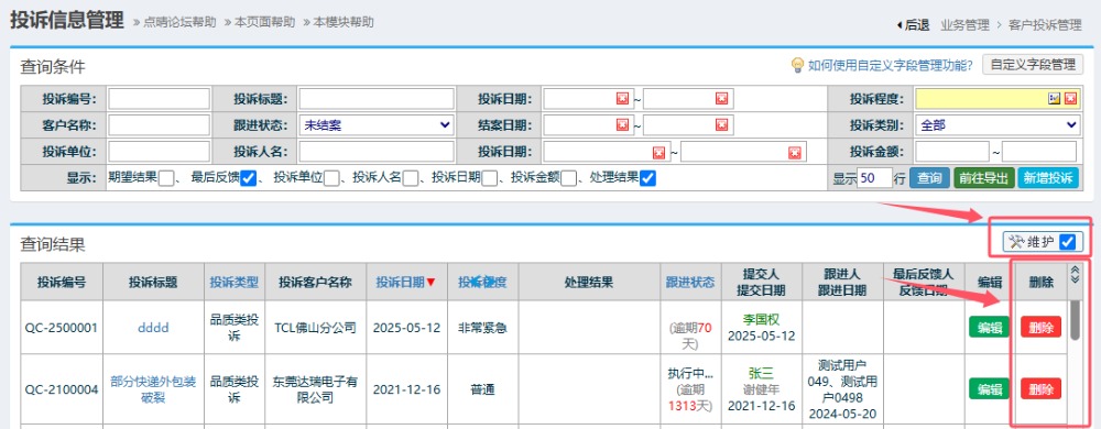 客户投诉信息怎么删除?