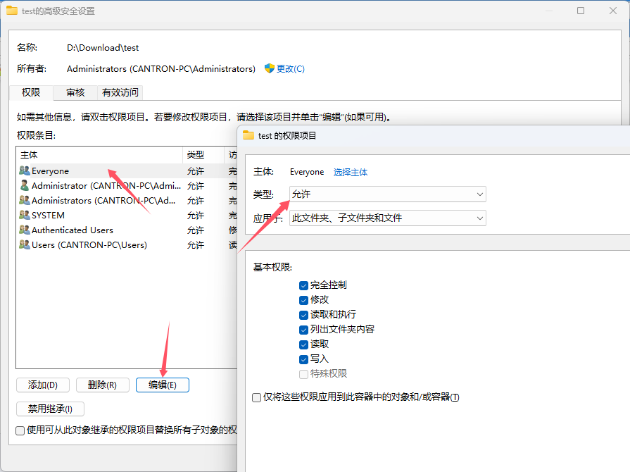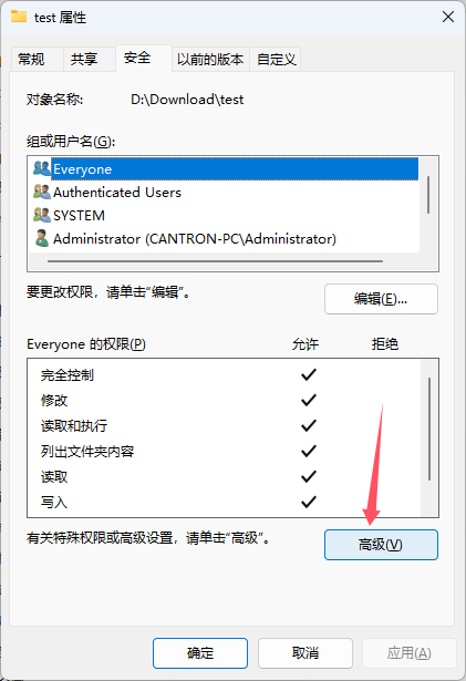 在目录的属性设置中,点击“高级”,就可以强制将everyone权限从拒绝改为允许,然后就可以正常访问此目录了。