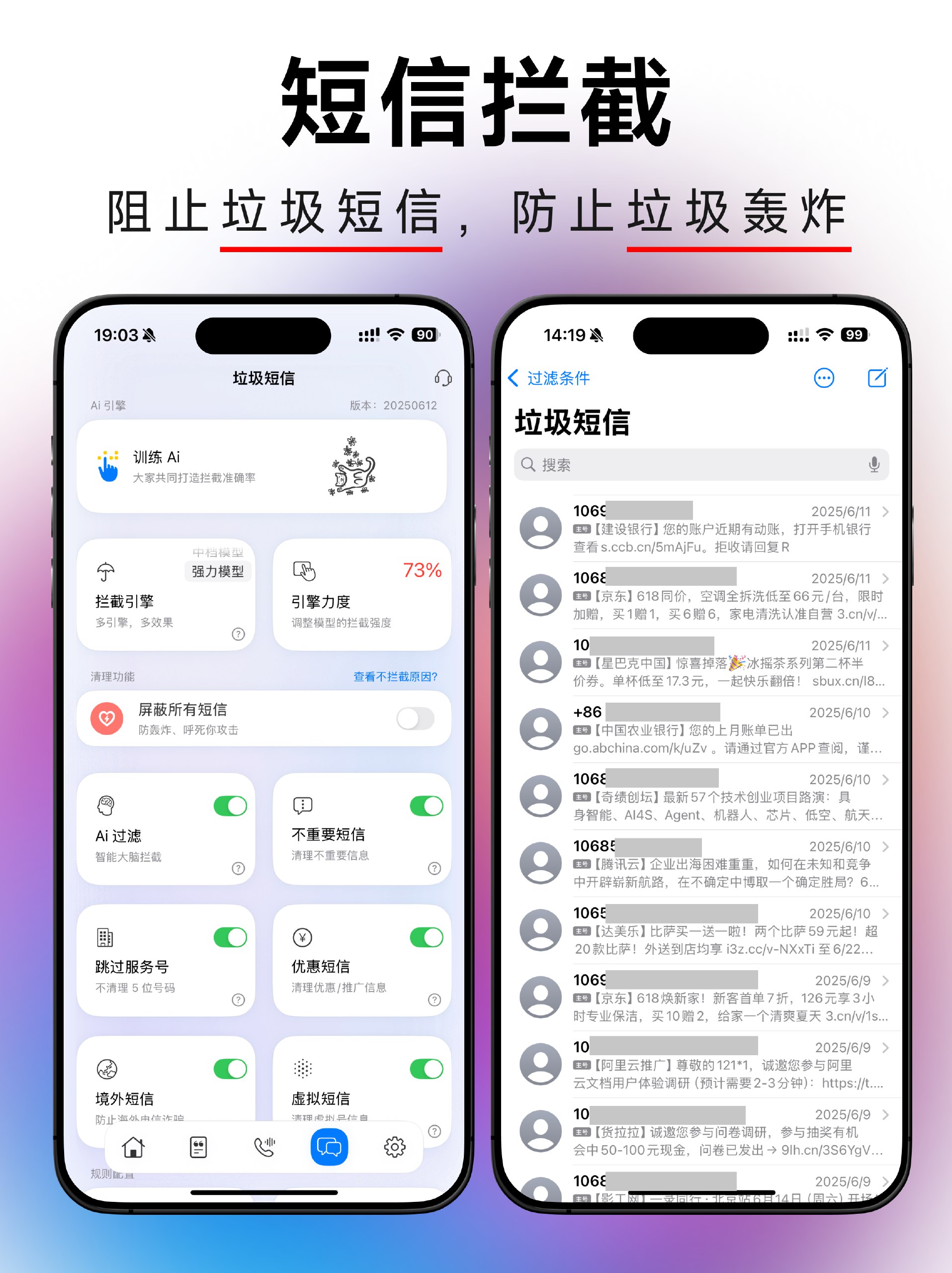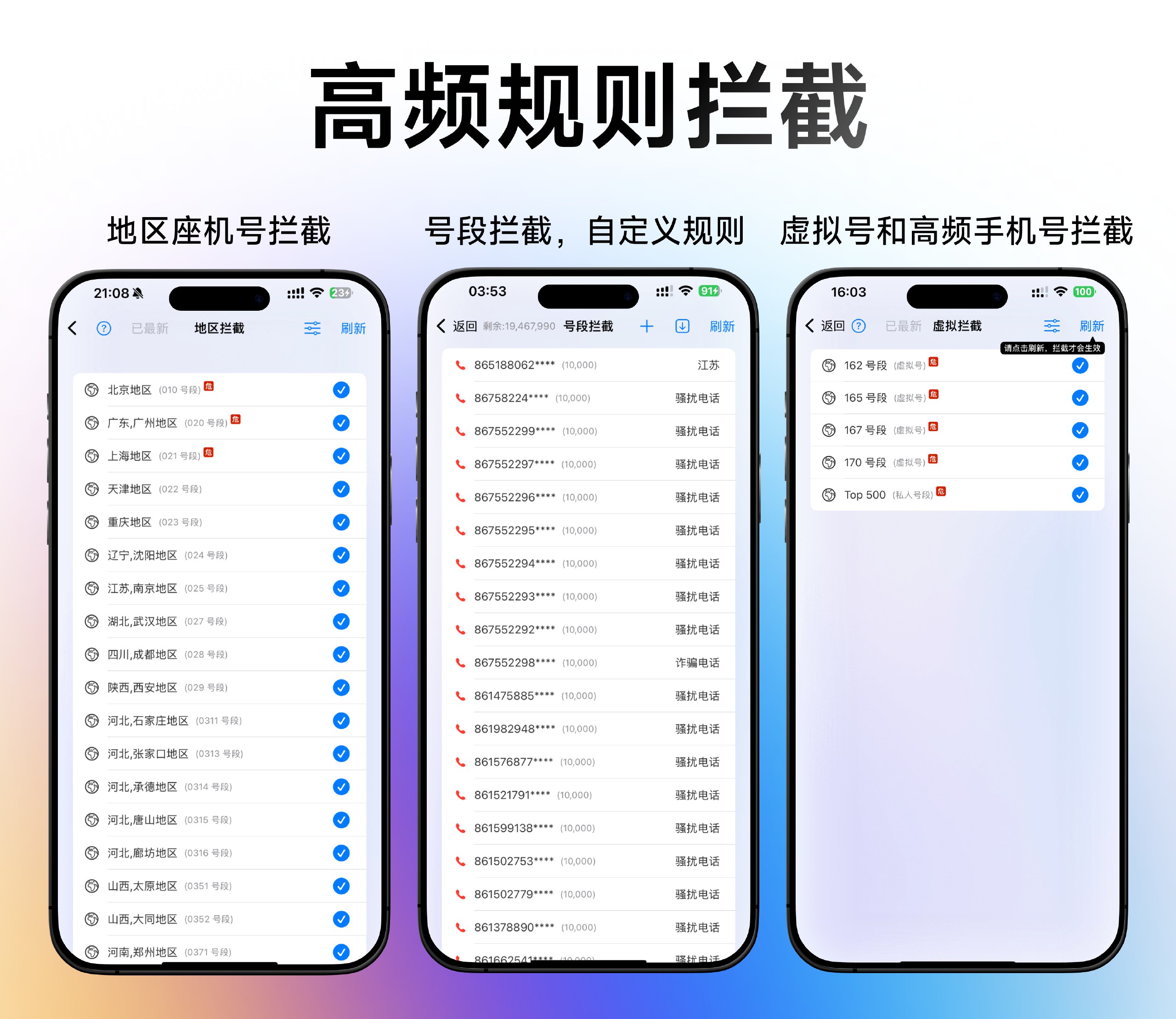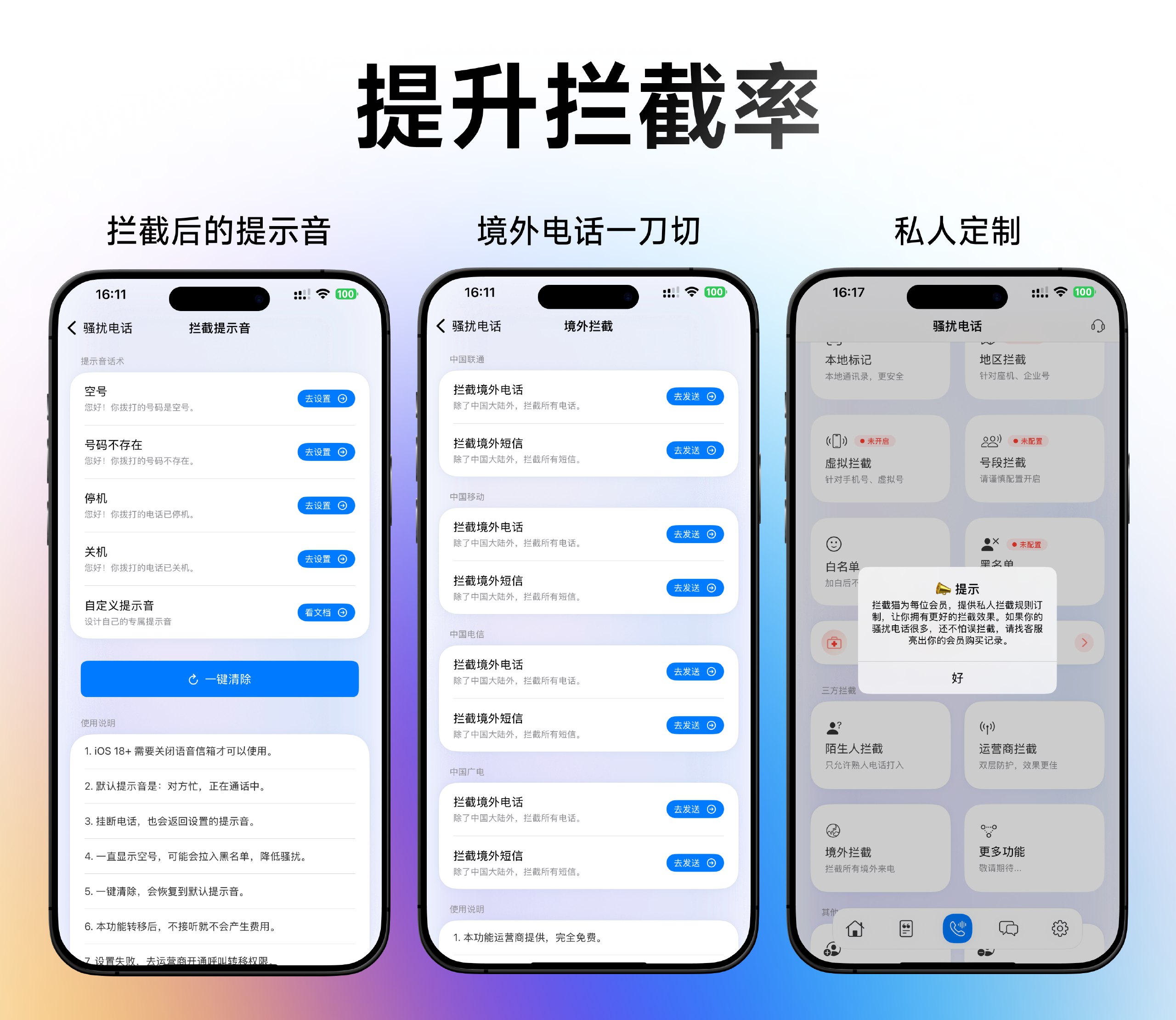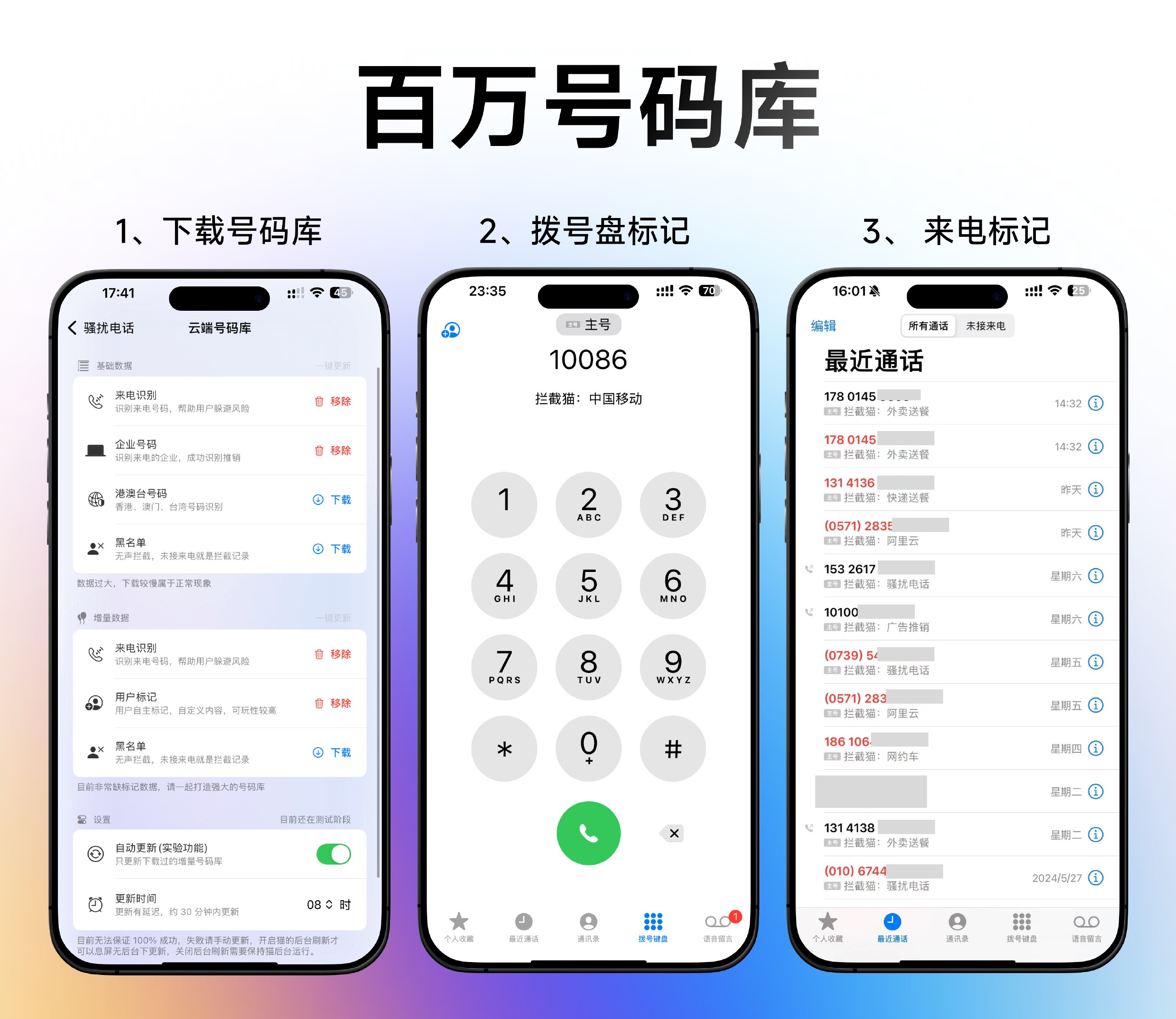 电话拦截因苹果系统权限不开放,依托本地离线和规则引擎,目前普遍能做到 60% - 80% 的拦截率。 百万号码库为了提升拦截率,猫只提供最新的 700W 号码库数据。但是也比同类 APP 数据多,市面上大多数 300W 的数据。 上亿规则拦截这才是拦截的关键,牺牲了号码库数据 (只有 700W),给强大规则 (1.13 亿拦截数据) 让路,提升拦截率,目前普遍可以做到 60%-80% 的拦截率。 提升拦截率