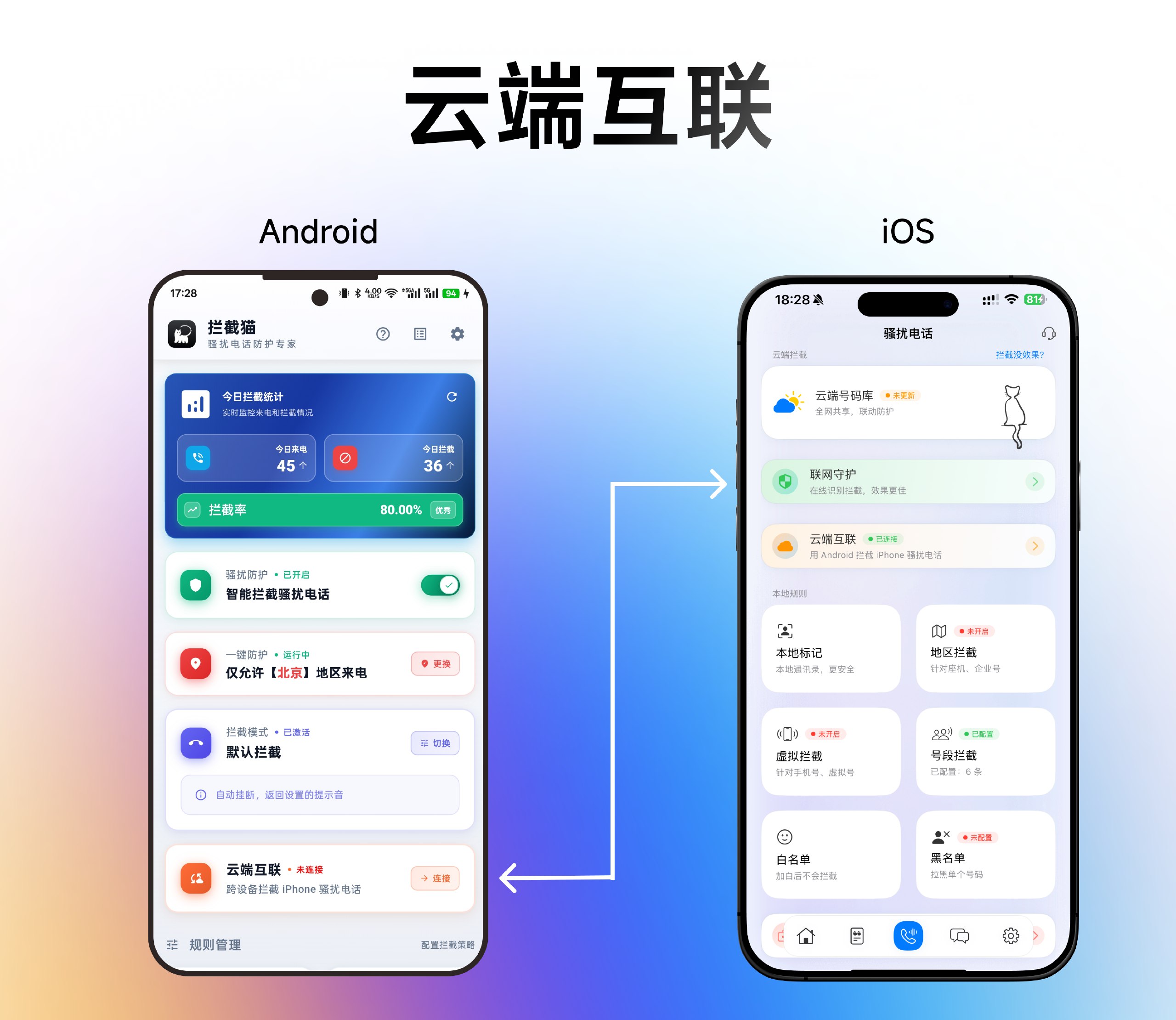 云端互联独家创新,用 Android 拦截 iPhone 的骚扰电话,完美解决 iPhone 不开放拦截不理想的问题。 短信拦截