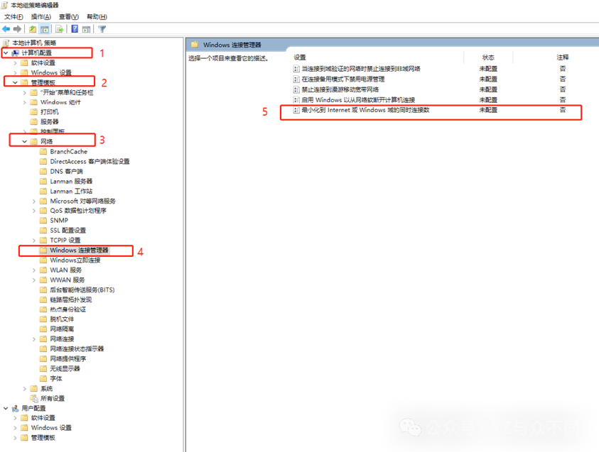 🔷 在组策略编辑器中,找到并选择 “最小化到 Internet 或 Windows 域的同时连接数”。