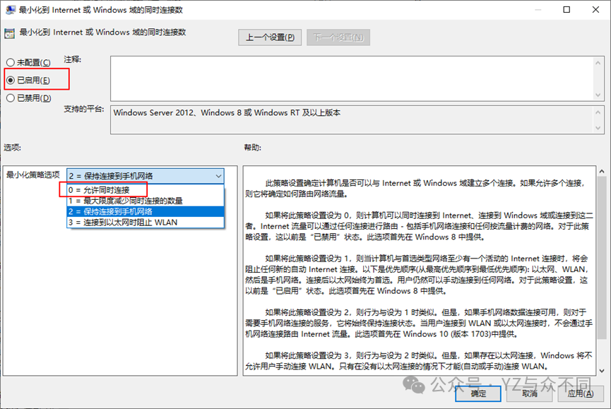 注意:将系统设置项值设置为 0 (允许同时连接) 是保证有线和无线网络共存的关键。修改取值后,请务必点击 “应用” 按钮使设置生效。