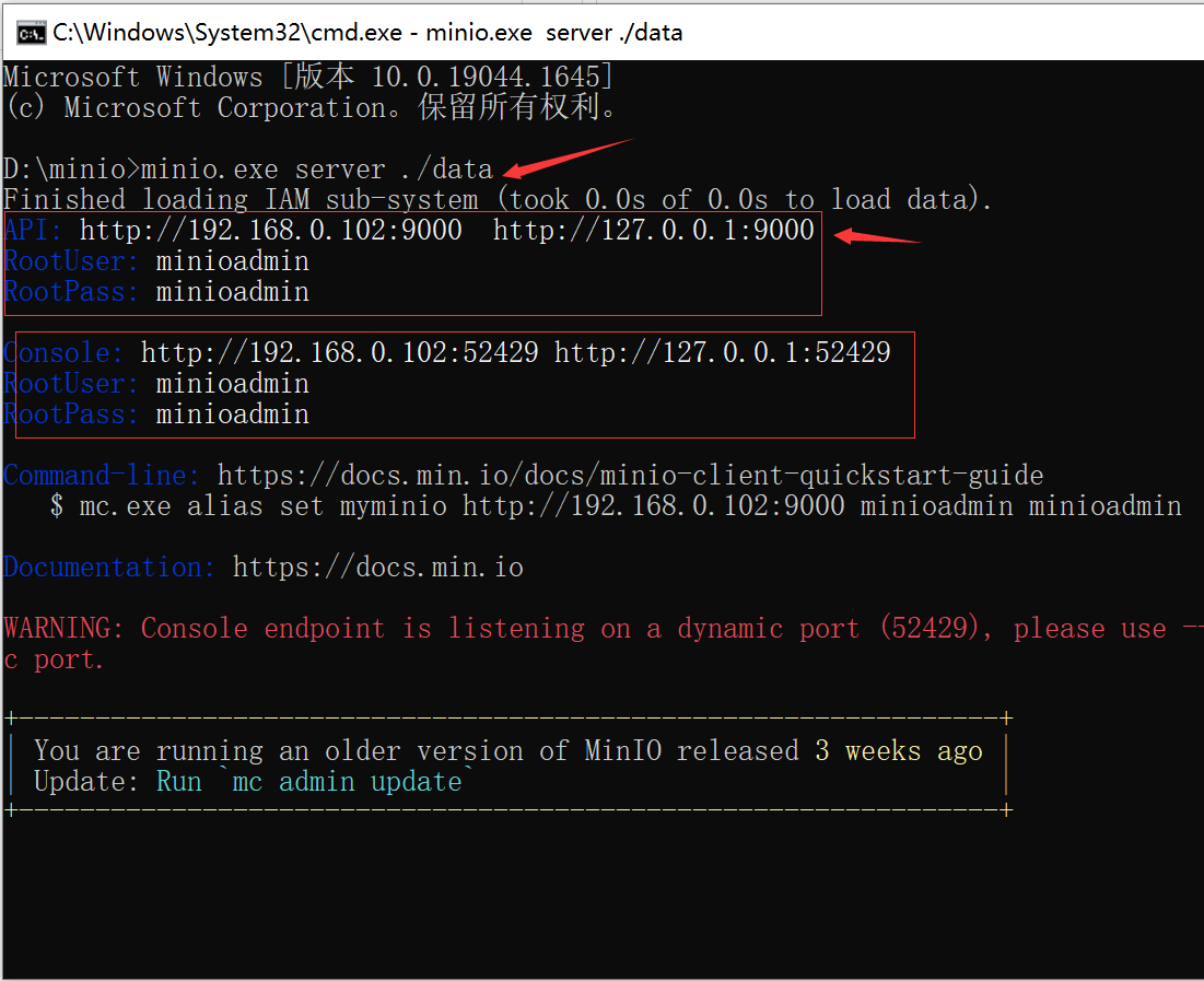 我们启动后控制台会输出如下信息,首先第一部分中是我们和Minio,进程通信的服务地址