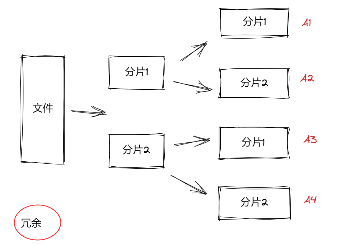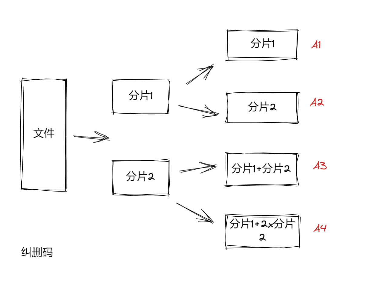 此时如果使用纠删码的做法就是,A1和A2分片数据还是保持不变,A3=分片1+分片2,A4 = 分片1+ 2*分片2,这样任意两份数据丢失,都可以恢复出分片1 和 分片2的数据了