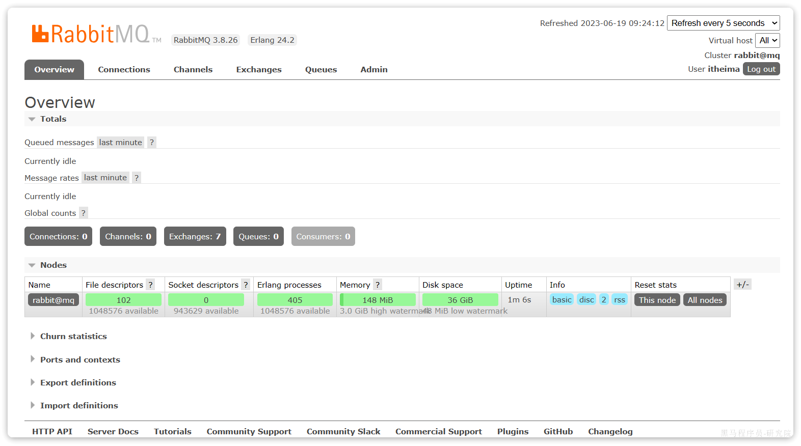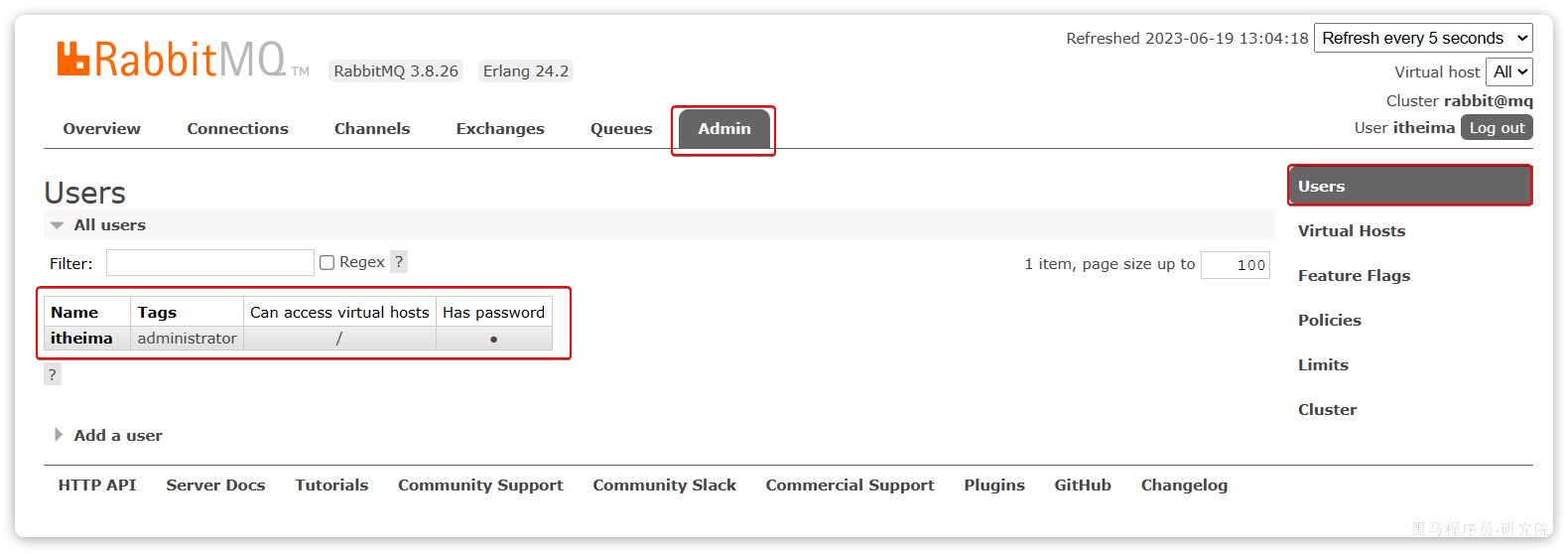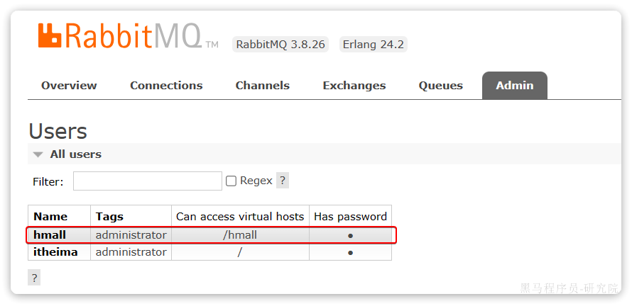 这里的用户都是RabbitMQ的管理或运维人员。目前只有安装RabbitMQ时添加的itheima这个用户。仔细观察用户表格中的字段,如下: