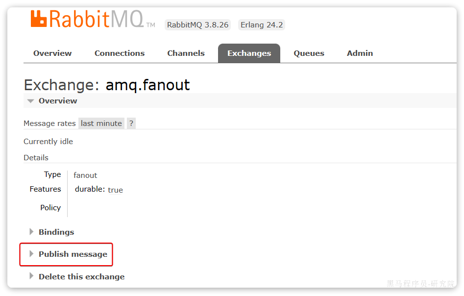 点击任意交换机,即可进入交换机详情页面。仍然会利用控制台中的publish message 发送一条消息: