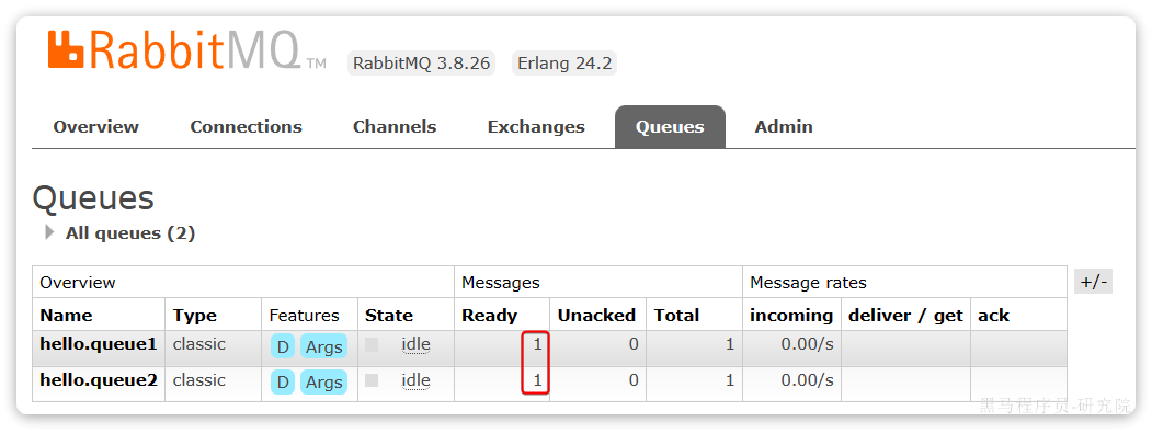 回到Queues页面,可以发现hello.queue中已经有一条消息了: