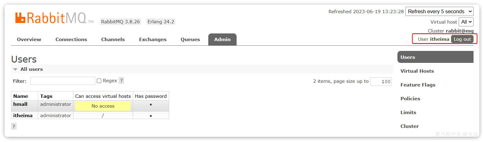 • Tagsadministrator,说明itheima用户是超级管理员,拥有所有权限