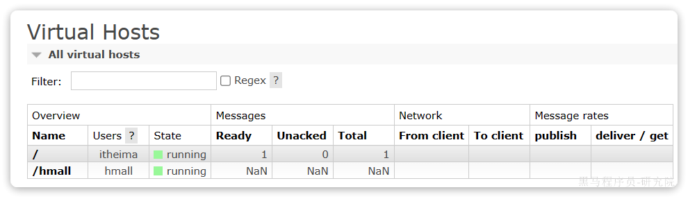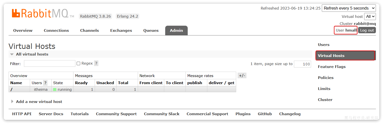 切换到刚刚创建的 用户登录,然后点击Virtual Hosts菜单,进入virtual host管理页: