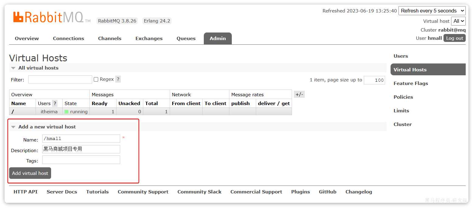 可以看到目前只有一个默认的virtual host,名字为 /