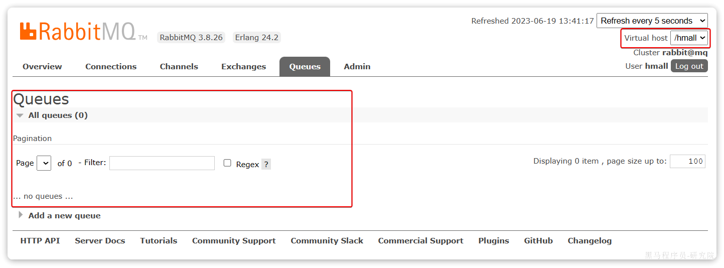 此时,点击页面右上角的virtual host下拉菜单,切换virtual host为 /hmall