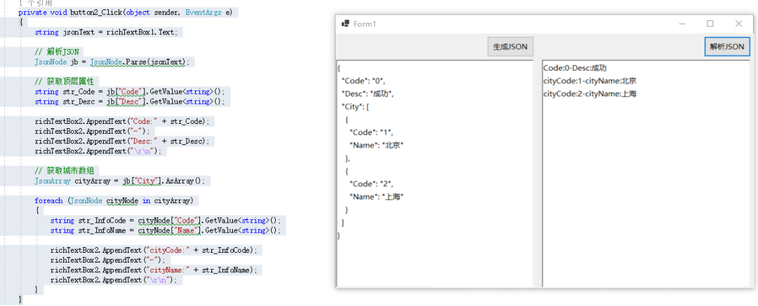 foreach (JsonNode cityNode in cityArray){    string str_InfoCode = cityNode["Code"].GetValue<string>();    string str_InfoName = cityNode["Name"].GetValue<string>();    // 显示处理结果...}