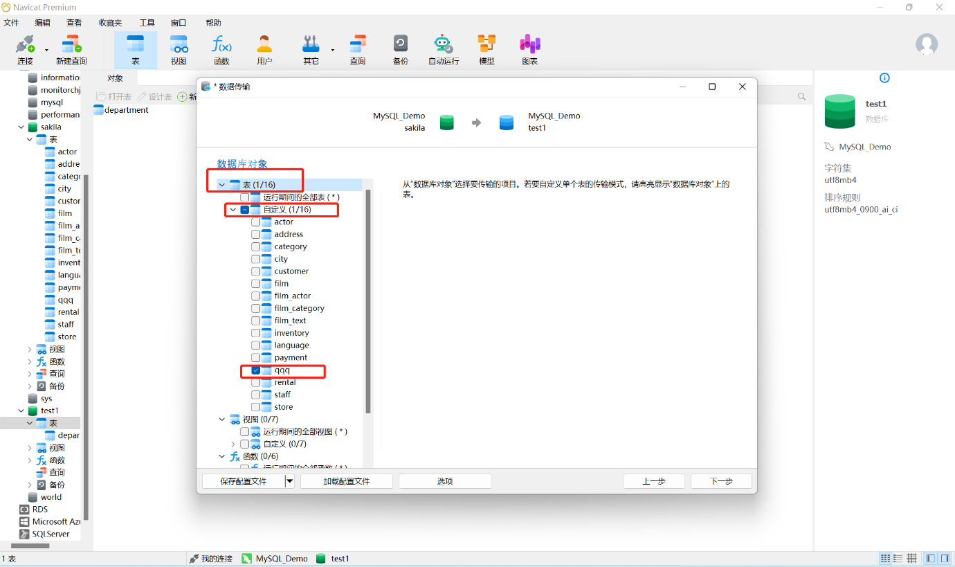 5、此处,在左侧的数据库对象中展开表和表下的自定义选项,勾选“qqq"表。(当然,根据实际需要,还可以勾选其他的视图/函数/事件等内容进行传输)。