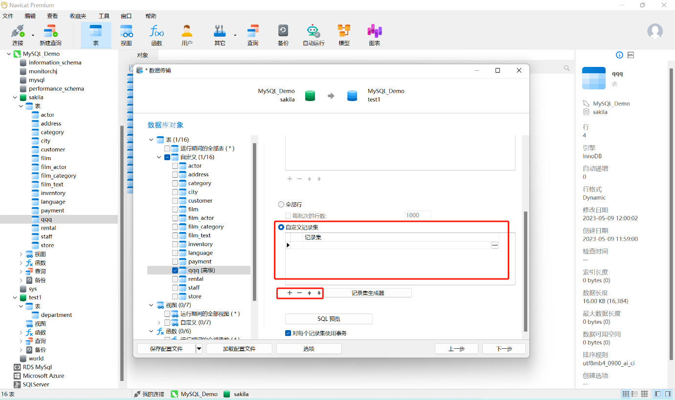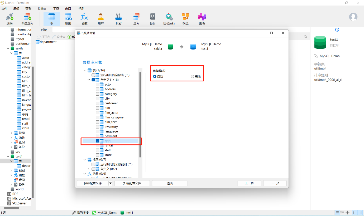 6、点击到勾选的表,右侧会显示两种传输模式:自动和高级。选择自动,Navicat 将使用默认设置进行传输。