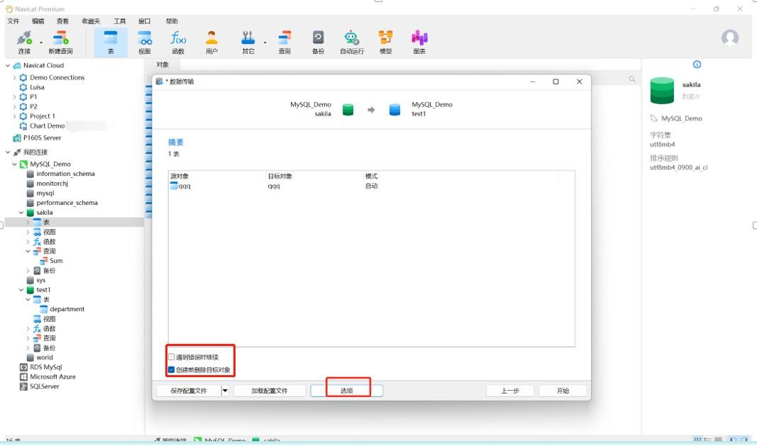 13、在点击开始传输前,我们可以根据需要选择勾选“遇到错误是继续”和“创建前删除目标对象”,这里就保持默认选择。