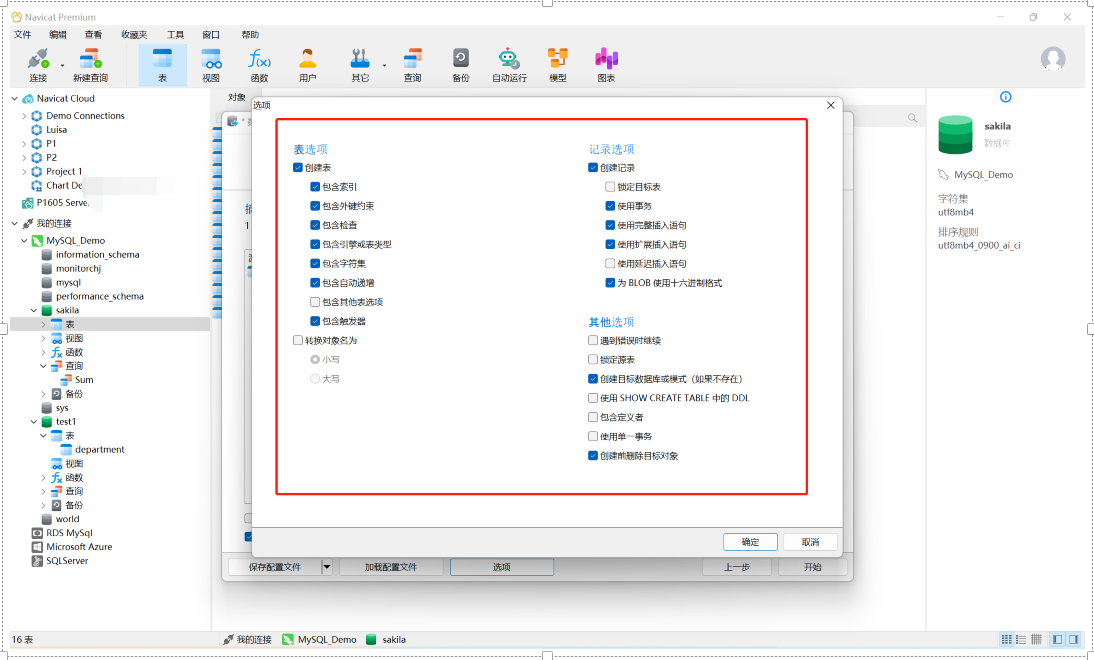 14、底部的“选项”按钮是关于源和目标数据库的相关传输设置,选项的界面会因数据库类型不同而有所不同。通常也可以保持默认选择。