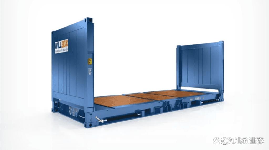 框架集装箱(Flat Rack Container)通常只有底部和两端的支撑结构,没有侧板和顶板。这种开放设计允许装载和卸载大型或超高货物,适合需要起重机吊装的货物。和开顶集装箱一样,其顶部和侧面需要用防水蓬覆盖保护。
