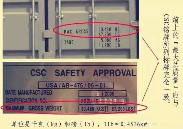 (1)额定重量和自定重量标记。额定重量即集装箱总重,自重即集装箱空箱质量(或空箱重量),应以公斤(kg) 和磅(lb) 同时表示;