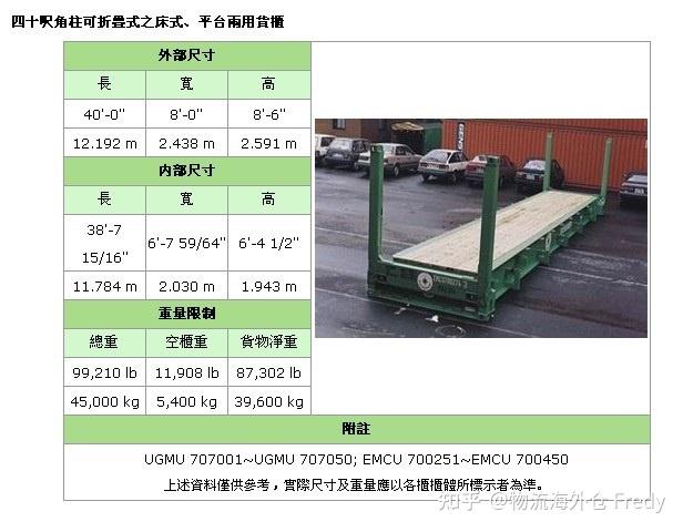 备注:集装箱适用于装载大型货物和重货,如钢铁、木材,机械,特别是像玻璃板等易碎的重货