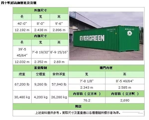 按照国际贸易货物的分类,一般分为散杂货和适箱货物。目前国际航运主干线上的适箱货物贸易基本上都已经采用集装箱运输。 集装箱的规格尺寸: 集装箱内部的最大长、宽、高尺寸。高度为箱底板面至箱顶板最下面的距离,宽度为两内侧衬板之间的距离,长度为箱门内侧板量至端壁内衬板之间的距离。它决定集装箱内容积和箱内货物的最大尺寸。 照片名称:20'GP(General Purpose Containe) 照片名称:40'GP(General Purpose Containe) 照片名称:40'HQ(High Cube Container 高柜) 照片名称:45'HQ(High Cube Container 高柜) 照片名称:20'OT(Open Top开顶) 照片名称:40'OT(Open Top开顶) 照片名称:20'FR(Flat Rack角柱式折迭平板) 照片名称:20'FR(Flat Rack角柱式折迭平板) 照片名称:40'FR(Flat Rack角柱式折迭平板) 照片名称:40'FR(Flat Rack板框式折迭平板) 照片名称:20'ISO TANK(罐式集装箱) 照片名称:40'超高挂衣柜 照片名称:20'Refrigerated(冷冻柜) 照片名称:40'High Refrigerated(冷冻柜)
