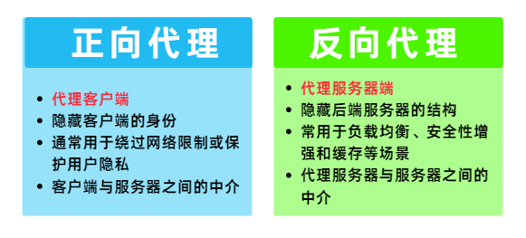 • 反向代理:代理服务器,隐藏服务器信息,适用于负载均衡、安全增强和内容加速。