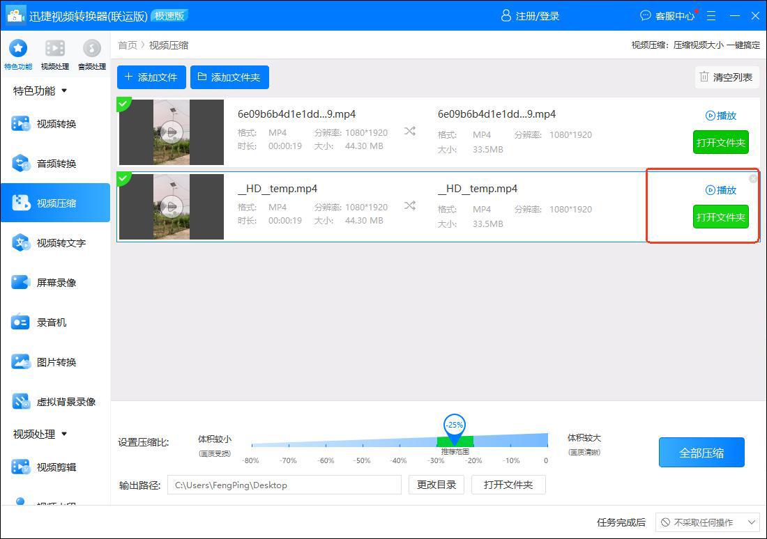 ③参数设置好后,点击“全部压缩”在指定文件夹查看。