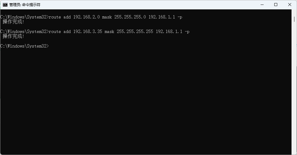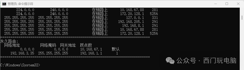 2)、-p这个参数如果不加的话,这条路由就是临时路由,重启电脑之后,路由就不能生效了。如果加上-p这个参数这条路由是永久路由,重启电脑后也不会失效。3)、如果只想让192.168.3.35这一个IP地址走内网路由,命令可以这么写:route add 192.168.3.35 mask 255.255.255.255 192.168.1.1 -p