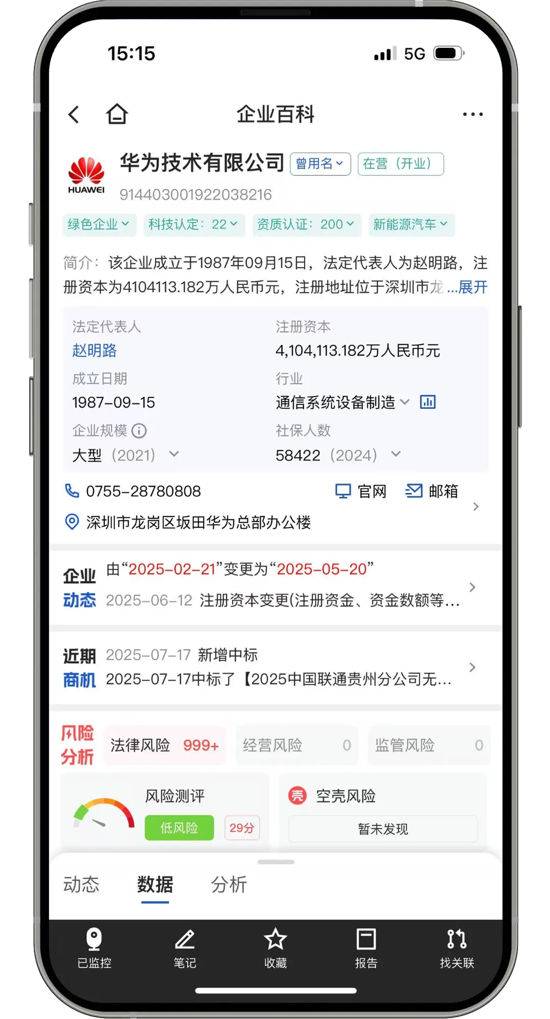 企百科灵动搜索,支持关键词精准检索,例如输入“华为”,可以搜索与其相关的企业、相关人员及所关联的法律风险、经营风险、商标专利等。