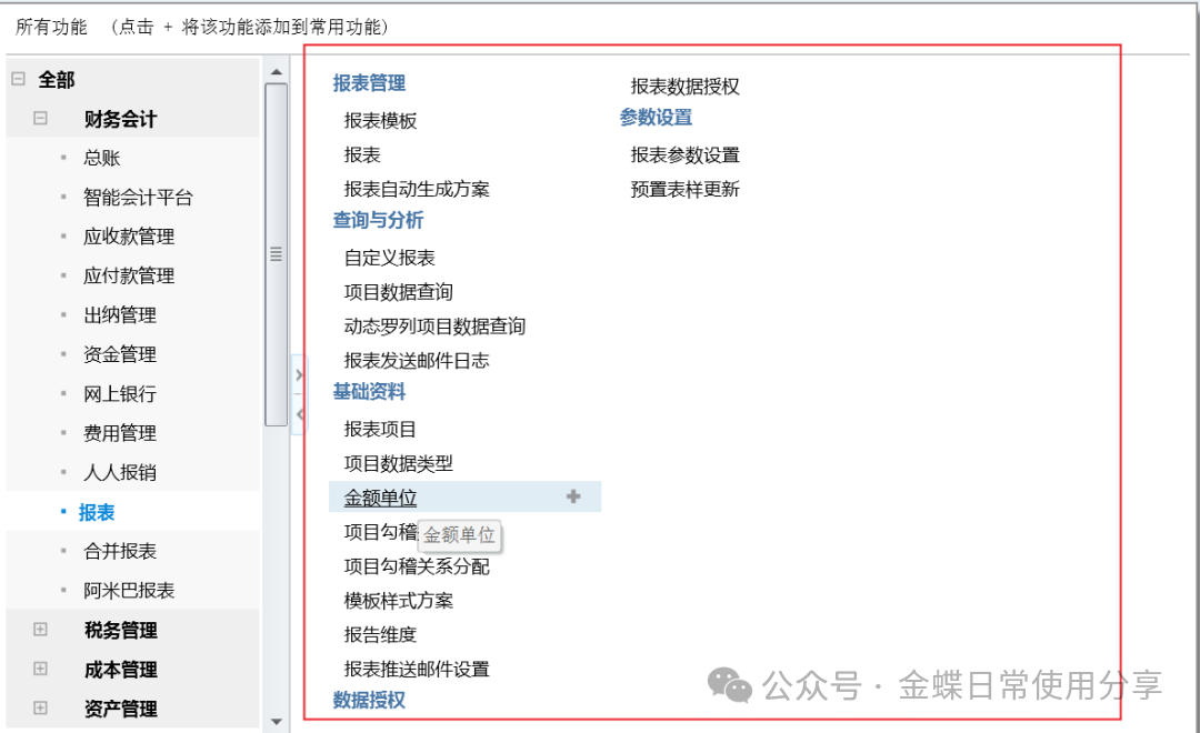 【功能菜单】:【财务会计】->【报表】->【基础资料】->【金额单位