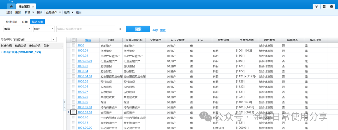 【操作说明】:系统预设了新会计准则的报表项目,用户可根据需要进行修改和新增。