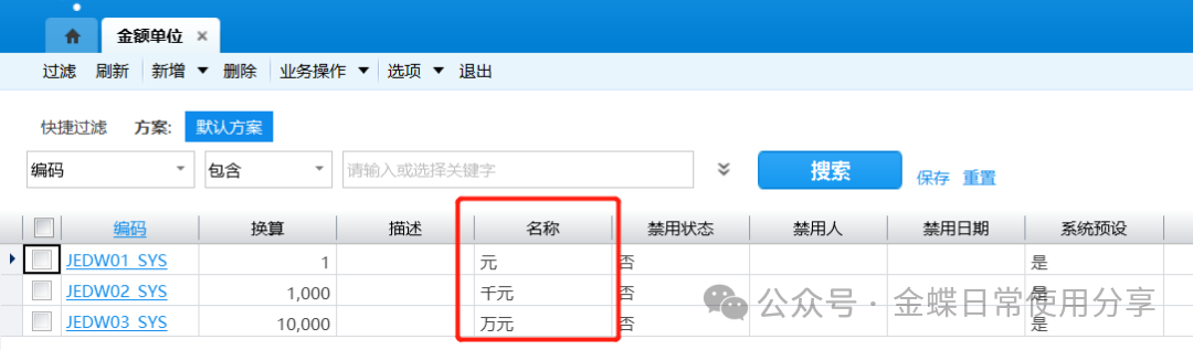 【操作说明】:系统预置了三种金额单位:元、千元、万元。