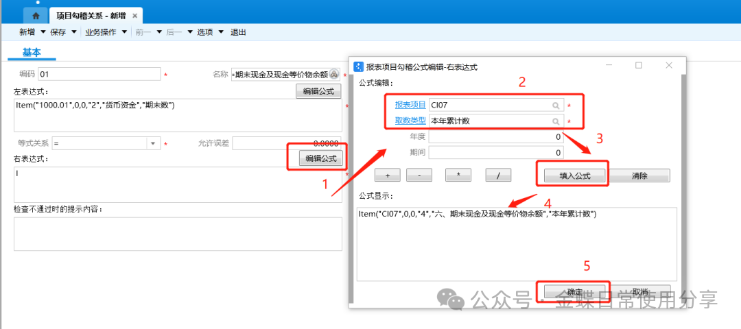 1.编辑左右表达式:在编辑公式对话框中选择报表项目、取数类型、年度及期间,选择完毕后点击【填入公式】,核算公式无误后点击【确定】;